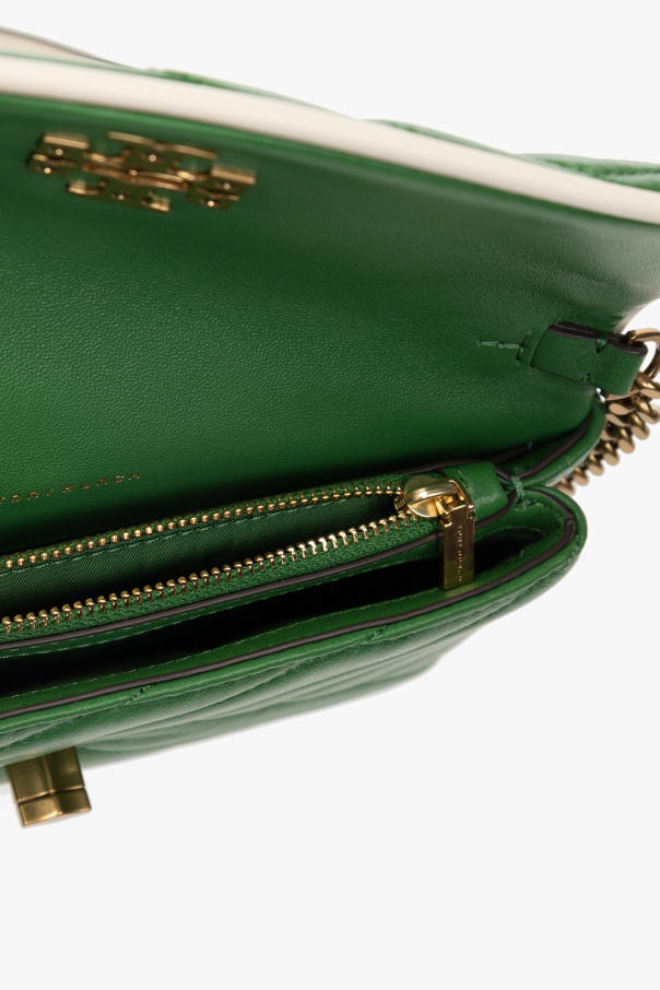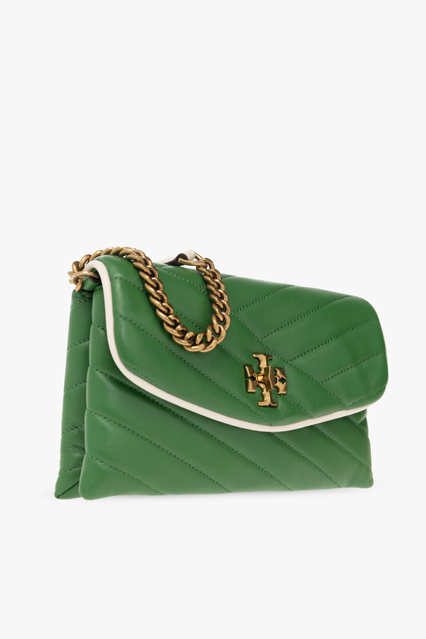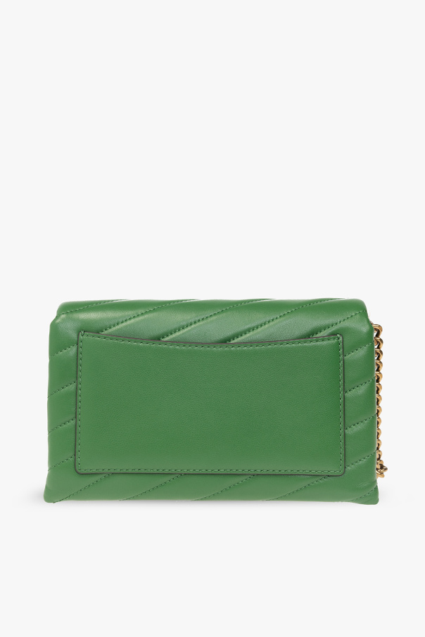 Green ‘Kira’ quilted wallet from Tory Burch. Made from sheep leather, this item fastens with a branded twist closure. It is complete with a back pocket, shoulder chain with a strap in cream, antique gold-tone metal hardware and two internal compartments with one zip pocket, one slip pocket and six card slots.