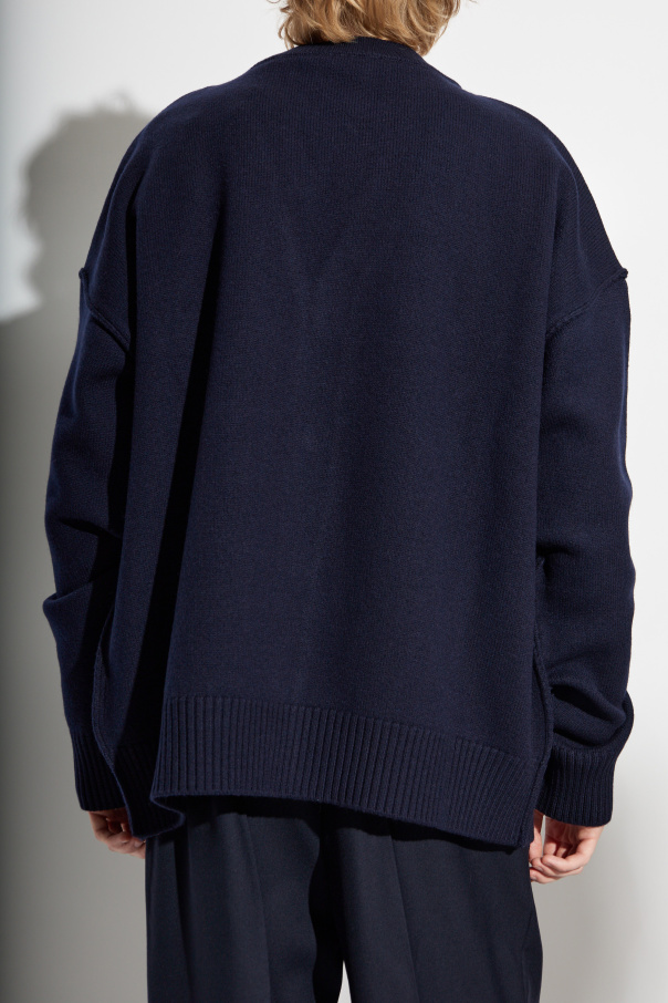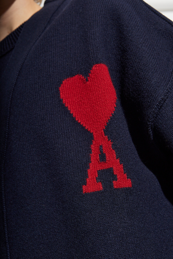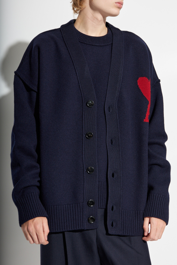 Introducing an exclusive cardigan from the renowned fashion house, AMI Alexandre Mattiussi. This navy blue cardigan, crafted from premium knit material, is the epitome of modern elegance, perfect for cooler days. The oversized cut lends a contemporary, relaxed look, while the long sleeves end in wide ribbed cuffs for added sophistication. The cardigan features a deep V-neckline and a front closure with five large, dark buttons. A distinctive red heart-shaped logo with the letter "A" beneath graces the left chest, adding a unique touch to this minimalist yet refined piece. Wide ribbed hem at the bottom enhances the overall aesthetic appeal. Why Choose This Product? High-Quality Material: Made from 100% wool, providing warmth and comfort. Distinctive Design: Oversized fit with a deep V-neck and unique heart logo. Elegant Details: Wide ribbed cuffs and hem, and five large buttons. Exclusive Brand: Designed by AMI Alexandre Mattiussi, known for blending casual and elegant styles with Parisian flair.