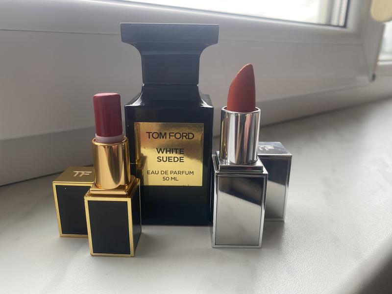 Парфюм Tom Ford White Musk Collection White Suede в остатку около 5 мл, ( фото 4), помада с крупными блестками, держательная несколько раз, названия с оттенком отсутствуют, мини-помада холодного красного цвета, состояние и остаток на фото