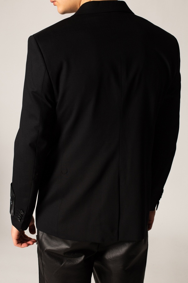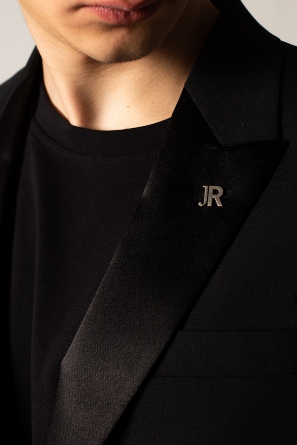 Black blazer from John Richmond. Crafted from wool, this item features a single button fastening, peaked lapels accentuated with antique silver-tone metalware with logo, three welt pockets and a sleeve patch.