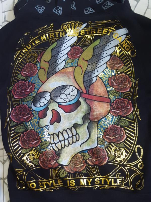 Тёплая х/б толстовка из плотного трикотажа с начёсом внутри, красочно декорированная фотопечатью,стилизованной под татуировки (стиль Ed.Hardy).Застёжка-молния спереди.Карманы "кенгуру".Капюшон,по краю которого проложена кулиска с утягивающим шнурком.