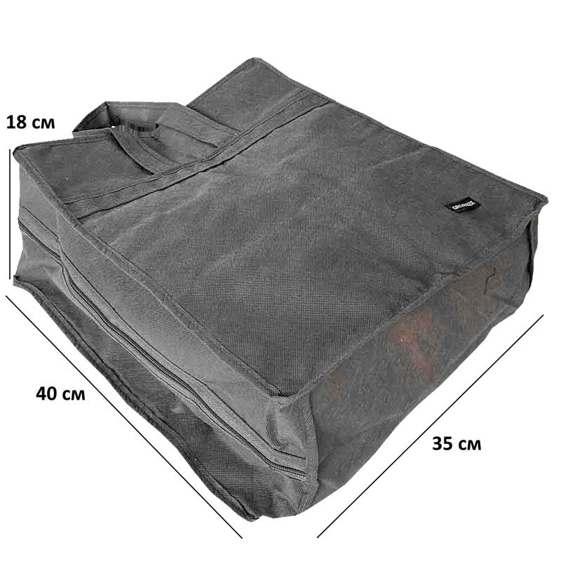 Вмещает 6 пар. Плотный спанбонд и ПВХ. Круговая молния. Размер: 40*35*18 смСостояние: НовоеЦвет:- Серый