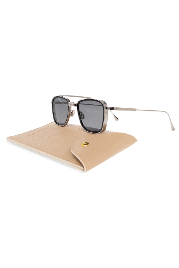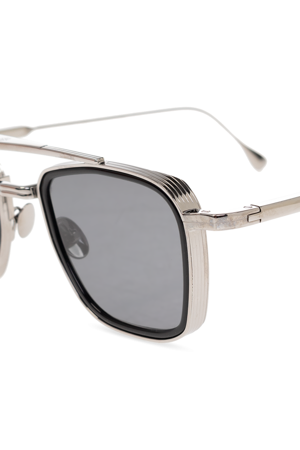 Silver-tone and black ‘Robert’ sunglasses from John Dalia. This pair has a rectangular ruthenium plated alloy frame (c. 3µ layer) with rims carved out of a 8mm engraved metal strip. The frame is enlivened by the brand’s signature double bridge, adjustable nose pads, thin temples with branded tips and grey anti-reflective CR39 lenses with UV protection. Case included. Handmade in France.