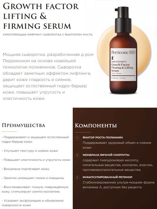 Укрепляющая лифтинг-сыворотка известной американской торговой марки Perricone MD является элитным бьюти-продуктом. Она разработана на основе технологии полиаминов. Это профессиональная косметика по уходу за кожей лица и шеи. Рекомендуется представительницам прекрасного пола после 25. Средство порадует универсальностью – подойдет для любого типа кожи. Мощная сыворотка, разработанная профессором Перриконом на основе новейшей технологии полиаминов. Сыворотка обладает заметным эффектом лифтинга, дарит коже гладкость и сияние, защищает естественный кожный барьер влаги, повышает упругость и эластичность кожи.