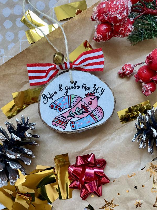 Ручна робота. Деревʼяний спил з дзвіночком на стрічці. Малюнок акриловими фарбами. Кожен спил в єдиному екземплярі. Подарункова пакування. Прикрасу можна вішати на ялинку, або ж використовувати як декор на стіну , тощо.