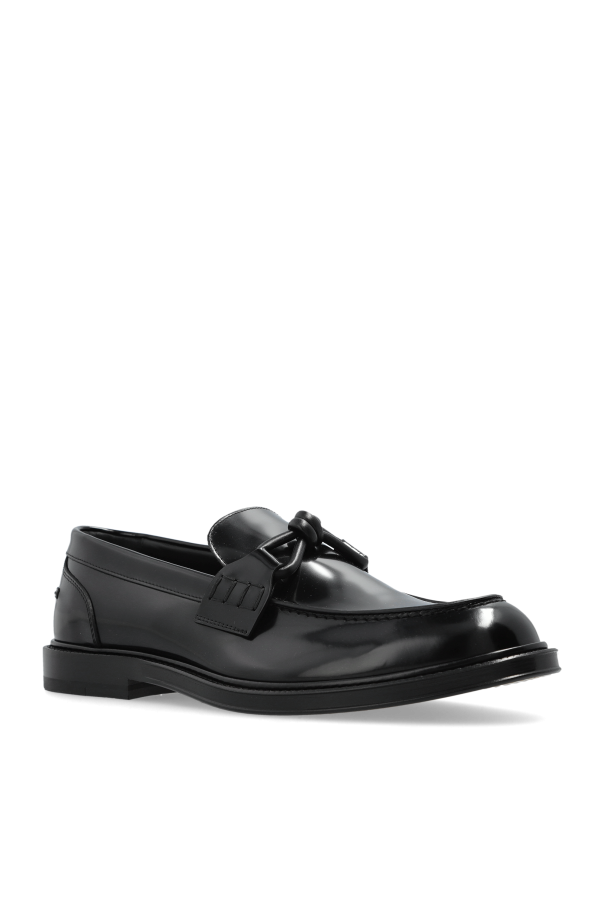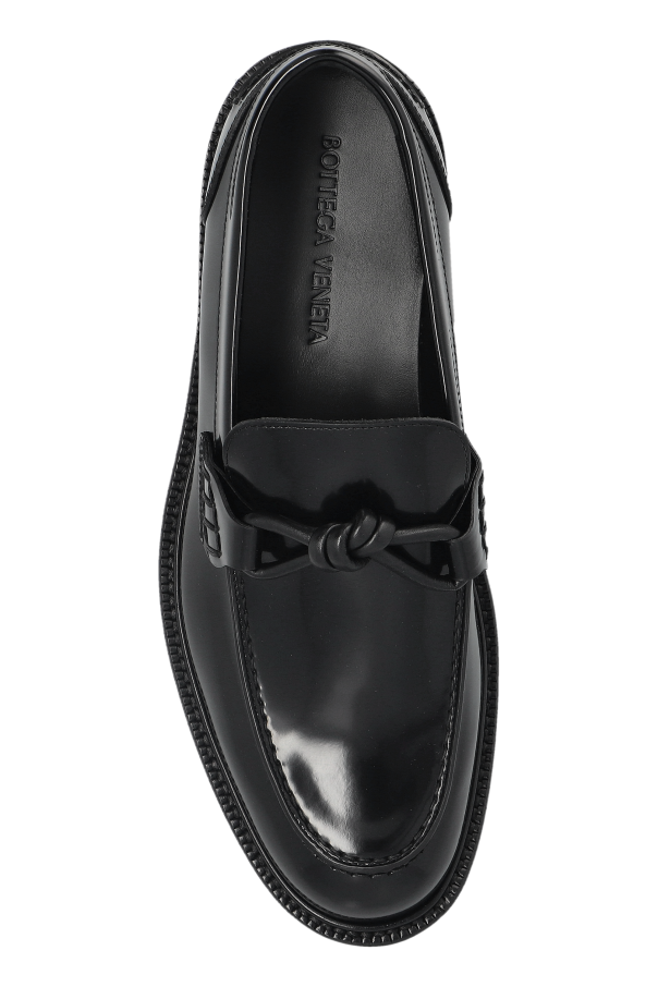 Introducing the Bottega Veneta 'Tie' Loafers, a quintessential embodiment of sophistication and style. Crafted from premium leather, these men's loafers exude a lustrous finish, adding a refined touch to your ensemble. Distinguished by a decorative front tie, these loafers seamlessly blend classic design with a unique flair. The flat sole ensures superior comfort, making them perfect for both formal and semi-formal occasions. The brand name elegantly embossed on the inner side underscores their exclusive nature. Why Choose This Product? Designed by the renowned Bottega Veneta, a beacon of innovation since 1966. Made from high-quality leather for a luxurious appearance and feel. Features a unique decorative tie, adding a distinctive touch. Flat sole design offers unmatched comfort for any occasion.