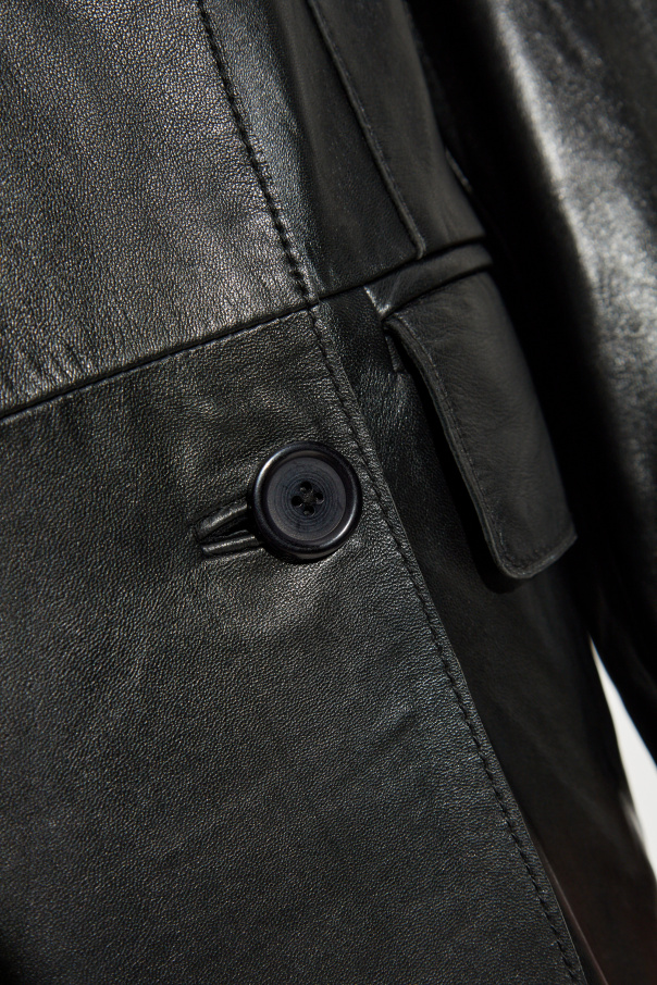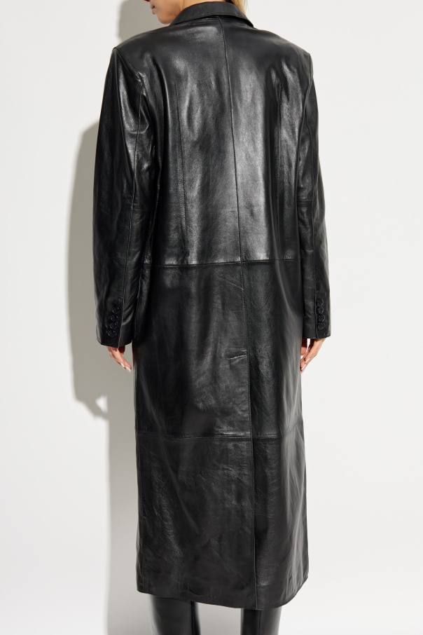 Introducing the Selene Leather Coat from the esteemed STAND STUDIO collection, designed by the renowned Nellie Kamras. This exquisite piece embodies the essence of Scandinavian minimalism, combined with luxurious materials and meticulous craftsmanship. Crafted from 100% Lambskin Leather, the Selene coat exudes an aura of sophistication and timeless elegance. The coat boasts a classic, straight silhouette that extends to mid-calf, enhancing its versatility and universal appeal. The wide collar and double-breasted button closure add a touch of traditional charm, while the smooth, high-quality leather ensures a sleek and polished finish. The coat features two front flap pockets, providing both practicality and style, and an additional discreet inner pocket for your essentials. The all-black buttons seamlessly blend with the coat's overall design, accentuating its refined aesthetic. This black leather coat is not only a chic addition to any wardrobe but also a testament to the brand's commitment to superior quality and sustainable practices. Why Choose This Product? Luxurious Material: Made from 100% premium lambskin leather. Timeless Design: Classic mid-calf length with a double-breasted front and wide collar. Practical Details: Includes two front flap pockets and a discreet inner pocket. Superior Craftsmanship: Impeccable stitching and attention to detail. Versatile Color: Elegant black, suitable for various styles and occasions.