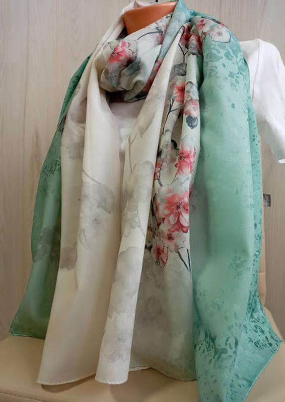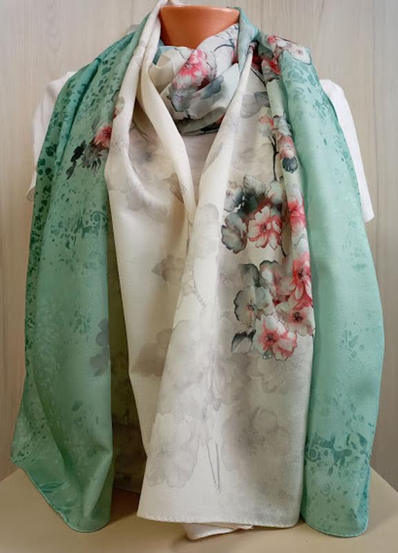 Нежный шифоновый турецкий шарф палантин, цвет переход от кремового к зеленому, фисташковому, абстракции с цветами. Прекрасный палантин на весну – лето – осень. Нарядный, легкий, воздушный. Идеально будет сочетаться с пальто, курткой, кардиганом, гольфом или рубашкой. Можно накинуть на плечи или надеть на голову.