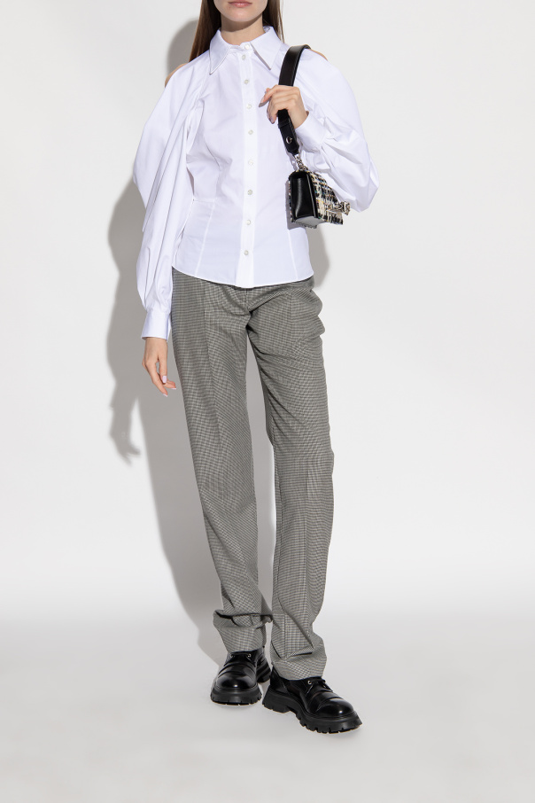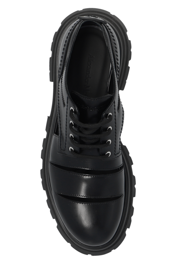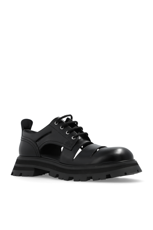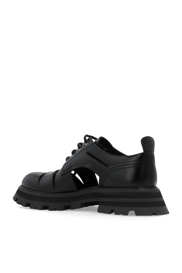 Black ‘Lucent’ Derby shoes from Alexander McQueen. Made of leather, this lace-up model sits on a black rubber sole and showcases a tactile logo at the back and decorative cutouts.