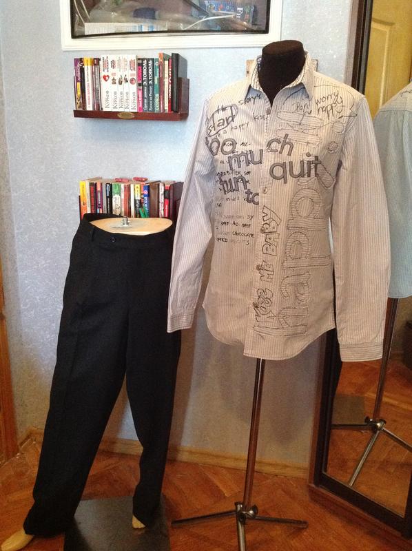 Рубашка в тонкую серо-синюю полоску. Впереди вышивка и аппликации, сзади на спине вышивка бренда.Состояние: Очень хорошееЦвет:- Белый