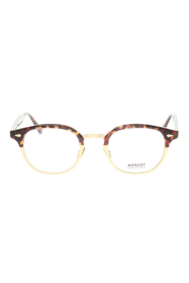 Brown and gold-tone ‘Lemtosh’ eyeglasses from Moscot embellished with printed pattern and logo.