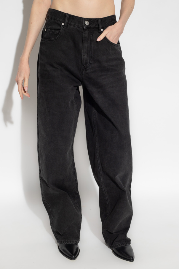 Black ‘Joanny’ jeans from Isabel Marant. Fastened with a zip and button, this pair falls with slightly tapered legs as well as three front pockets and two back pockets.