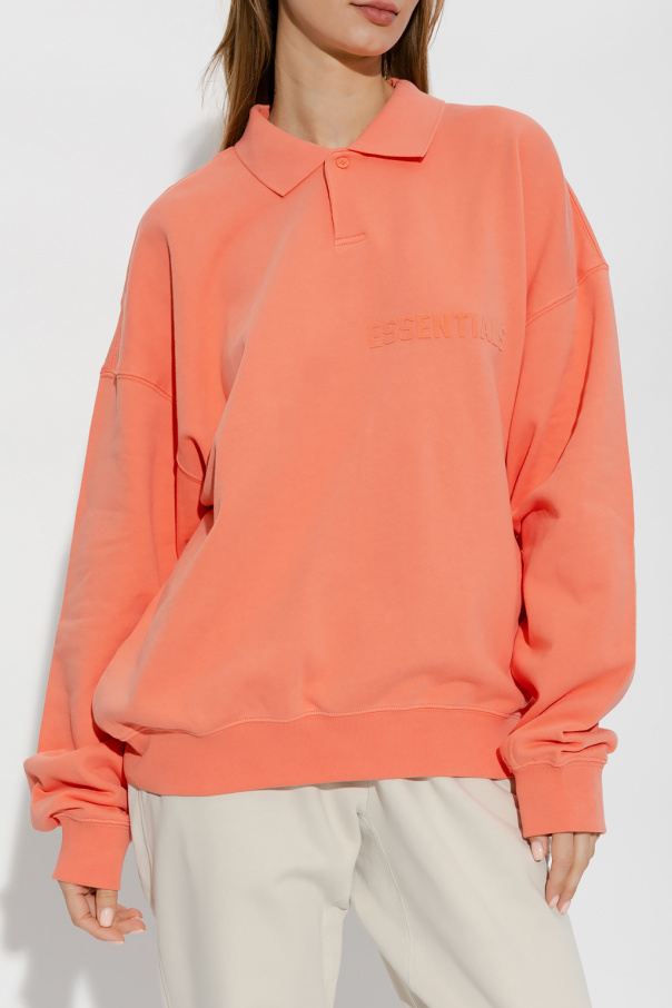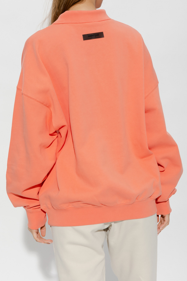Pinkish orange loose-fitting sweatshirt from Fear Of God Essentials. Made of cotton, this design features a buttoned collar, logo print with a velvet finish, the label’s signature rubber patch in black and ribbed trims at the hem and cuffs.