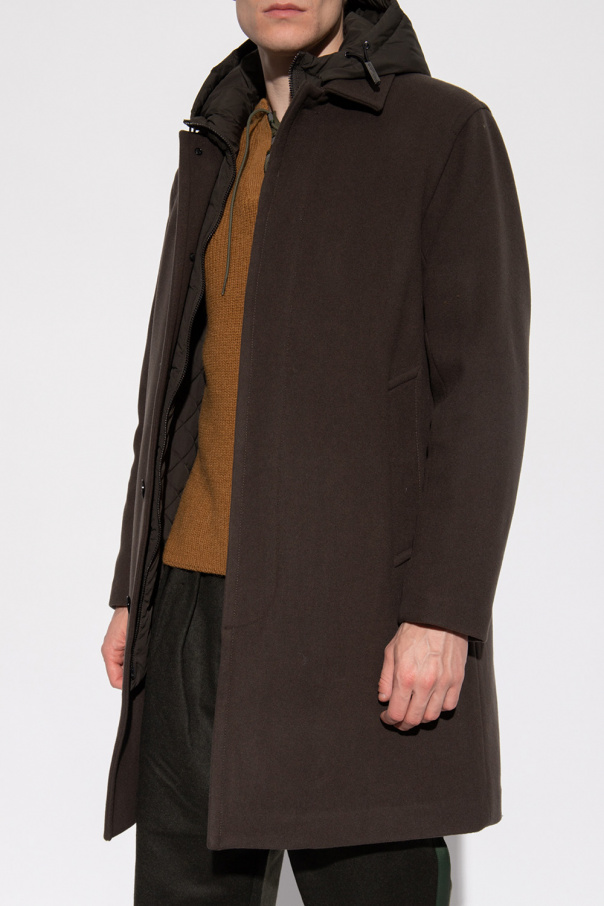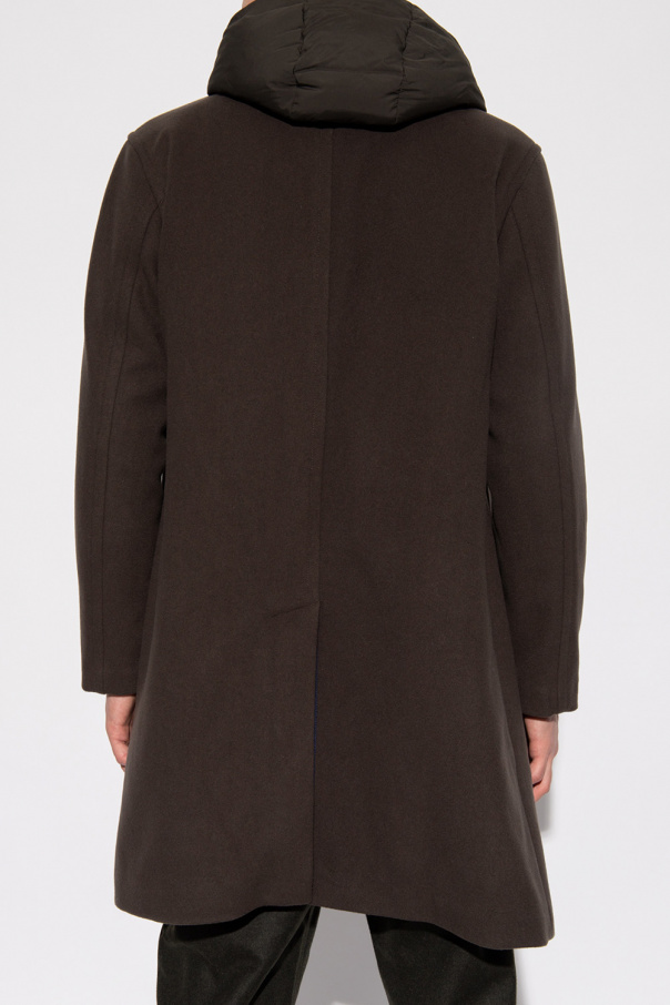 Dark green coat with a detachable hood from Emporio Armani. Crafted from wool, this style fastens via a two-way zipper and buttons and features two snap-fastened pockets on the front, a single back vent and long sleeves.