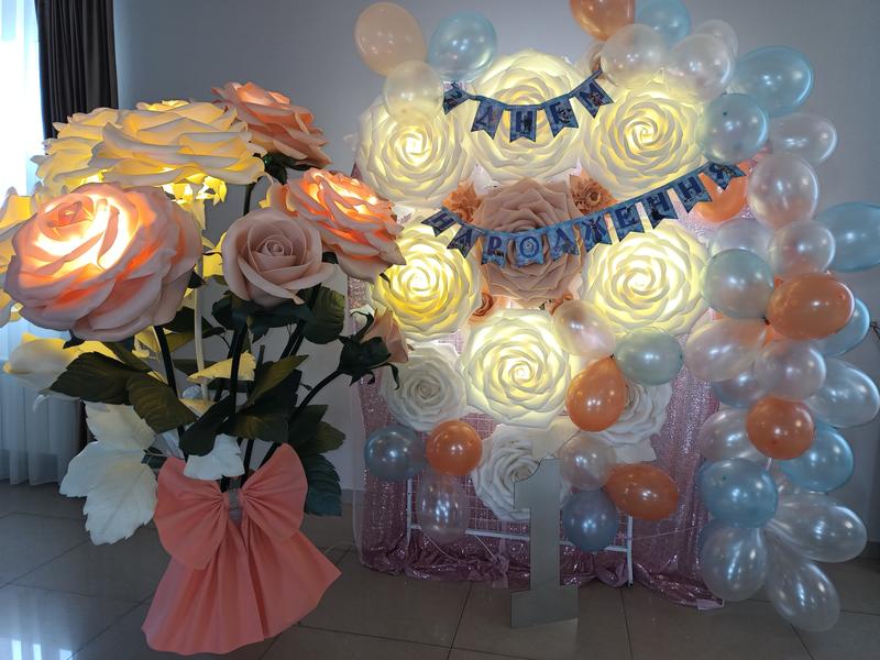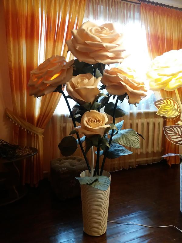 Букет из пяти роз цвета беж в кашпо выполнен из изолона.Три розы светящиеся.