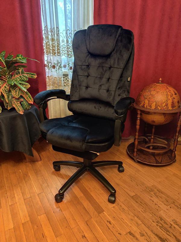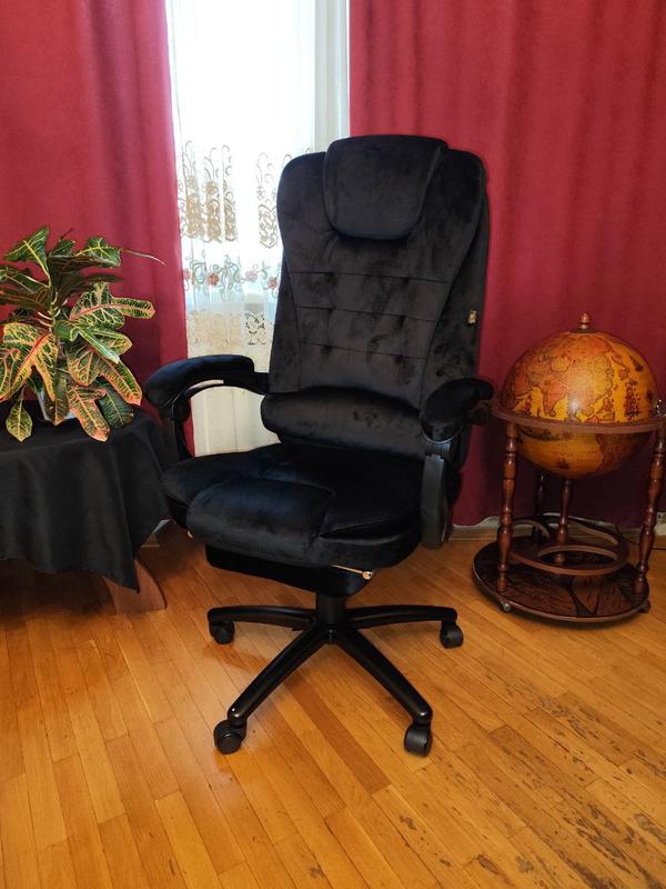 Оно очень приятное на ощупь и не парит как кожа, цвет очень красивый – глубокий черный. Все механизмы работают четко и плавно, откидная платформа для ног удивительно крепкая.