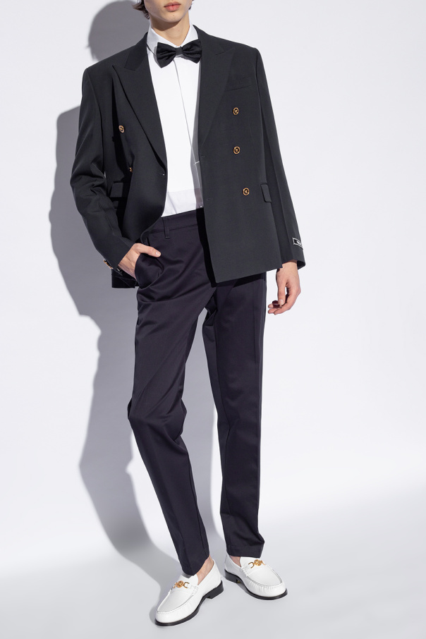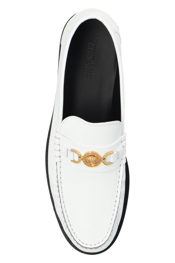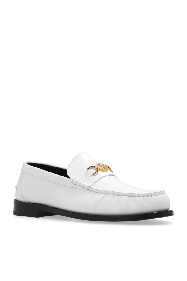 White loafers from Versace. Made from smooth leather, this model sits on a black leather sole and showcases gold-tone hardware with the brand's signature Medusa face and Greca motif on the front.