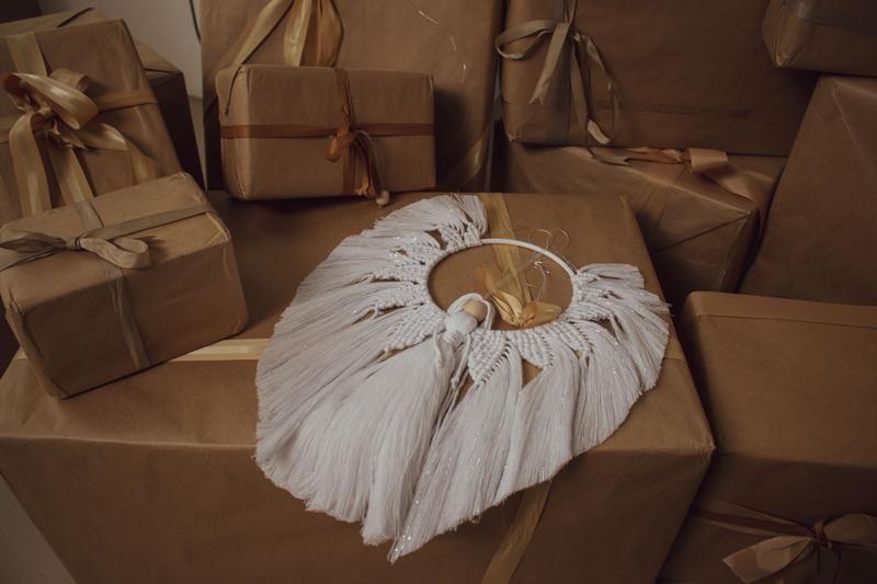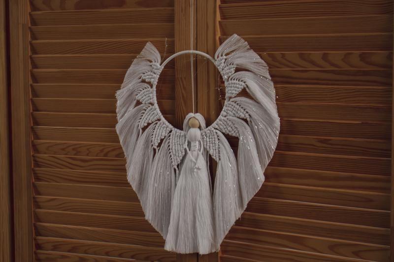 Ангел декор на стену выполнен в технике макраме из натурального хлопкового шнура.