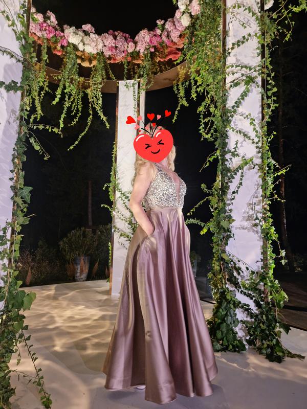 Вечернее, свадебное длинное платье. Цвет капучино. Верх -сетка с Т образным вырезом, расшитая камнями , бусинами и паетками. Пышная юбка- атлас. Размер М. Грудь- 85-92 см, талия 70-80 см, бедра свободны. Длина от пояса до конца юбки 112 см. На рост 170-174 см.