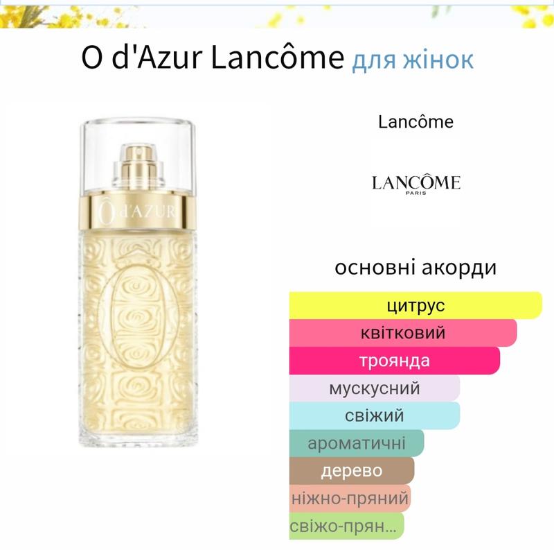 Туалетна вода для жінок Lancôme ’d'Azur поєднує в собі пахощі квітів і фруктів, що ростуть на узбережжі, розпечений пісок та свіжий бриз Середземного моря. Її аромат дарує відчуття нестримної свободи, шалених літніх пригод та безтурботного відпочинку на пляжі.свіжий фруктово-квітковий аромат, натхнений Лазурним узбережжям