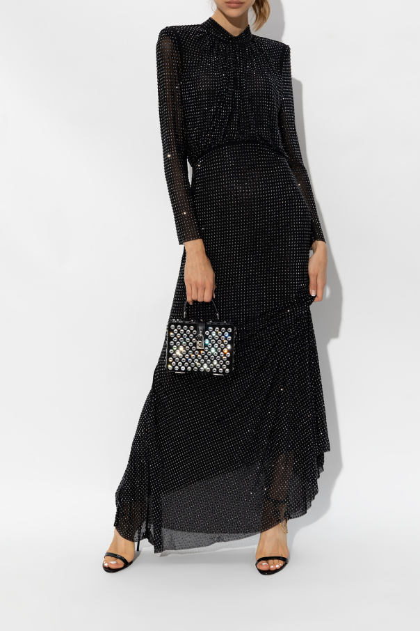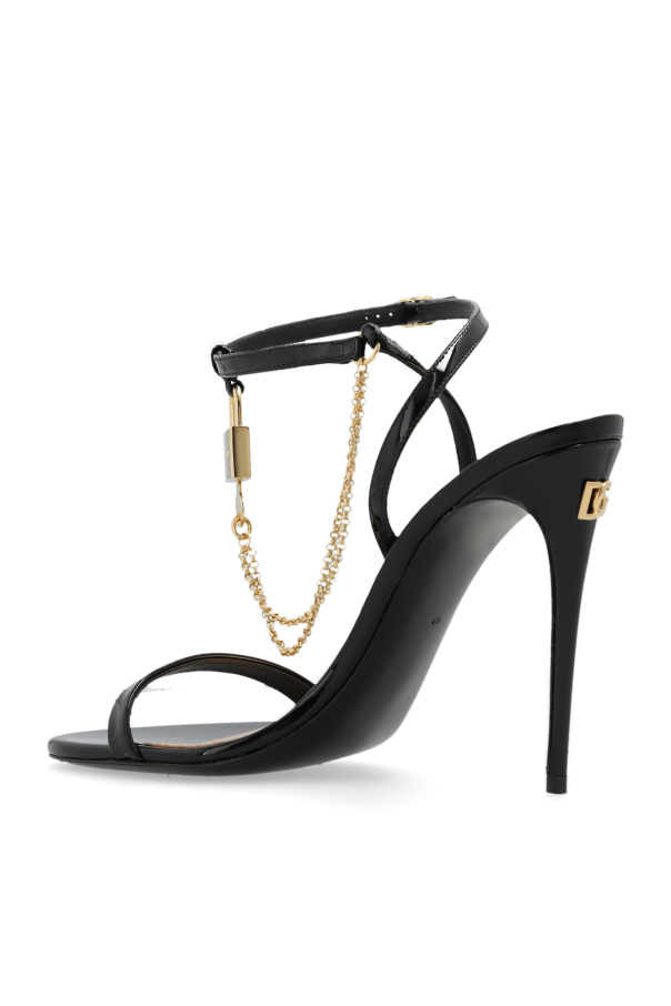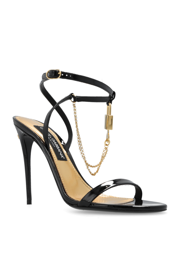 Black ‘Keira’ heeled sandals from Dolce & Gabbana. Made of patent leather, this design features an adjustable ankle strap with a decorative chain and logo-engraved padlock as well as a rounded toe and black leather sole.
