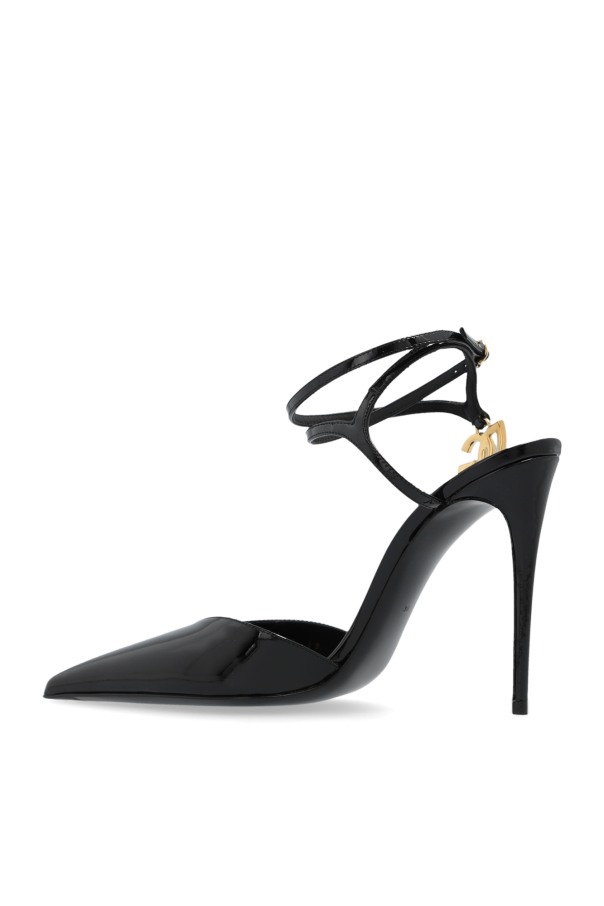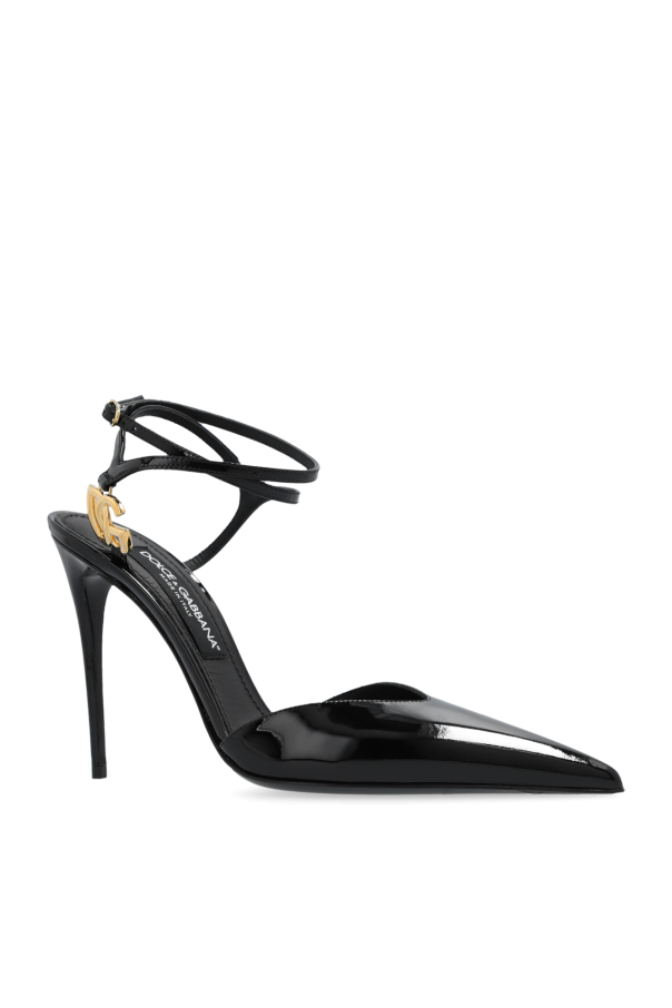 Black ‘Lollo’ glossy pumps from Dolce & Gabbana. Made from leather with a pointed-toe silhouette, this model sits on a black leather sole with a rubber toe and features an adjustable ankle strap with a gold-tone logo plaque on the buckle and a high slender heel.