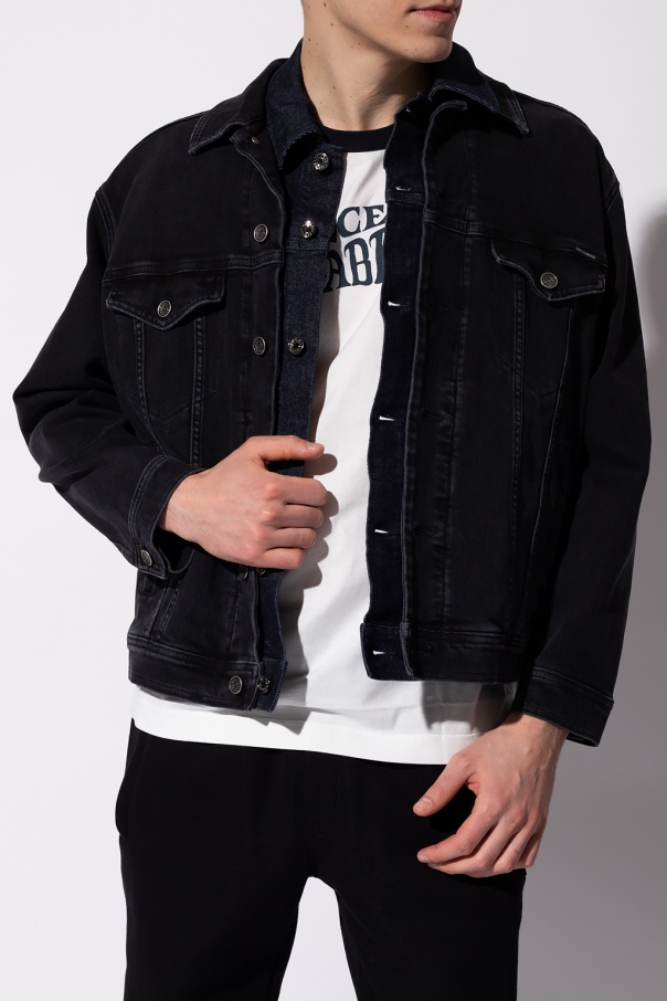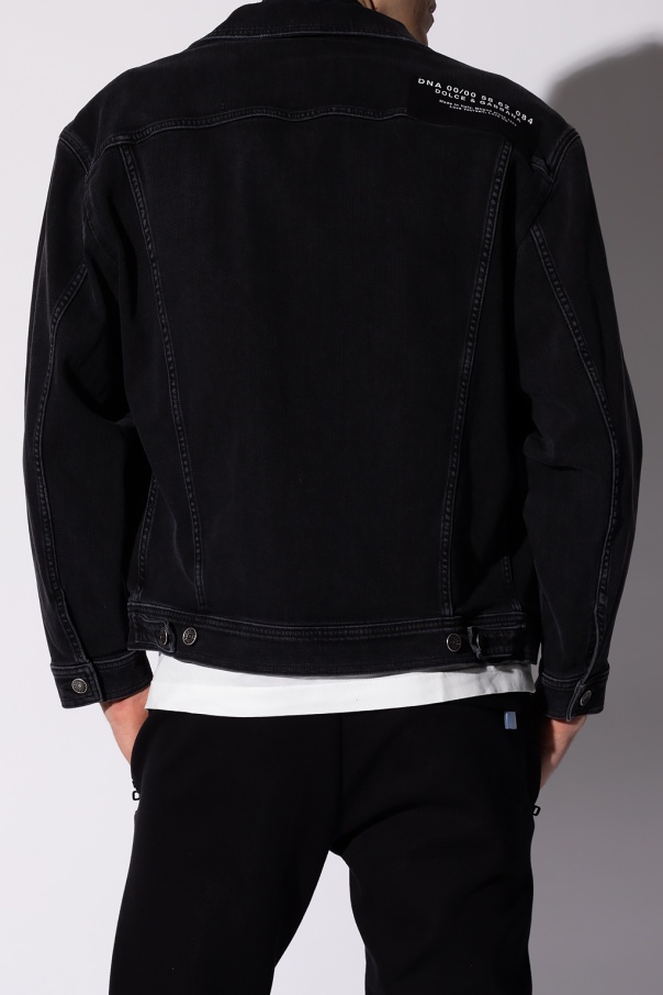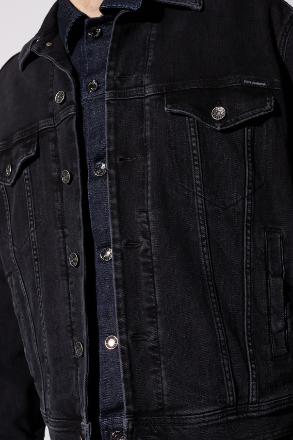 Black and navy denim jacket from Dolce & Gabbana. Fastened with buttons, this garment is complete with two white logo patches, two buttoned flap pockets and two slip pockets.