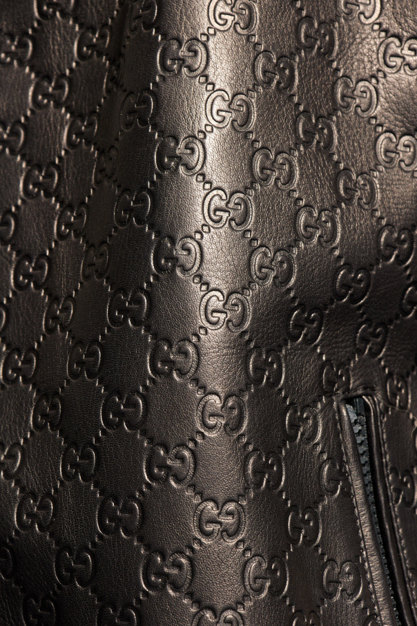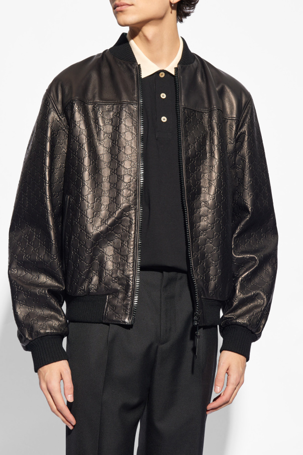 Black bomber jacket from Gucci. Made of lamb leather, this long sleeve design features a zip fastening, embossed monogram pattern, two zip pockets and ribbed trims at the neck, hem and cuffs.