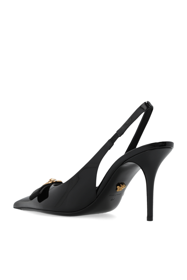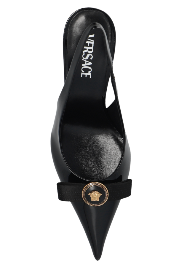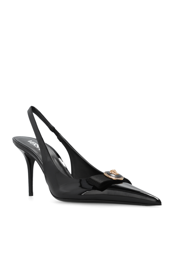 Black pumps from Versace. Made of leather, this pair features an elastic strap at the heel, pointed toe, Medusa head and black leather sole.