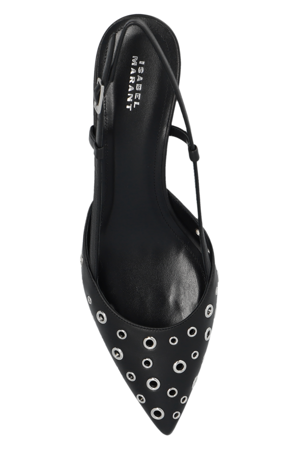 Introducing the exquisite 'Pilia' high-heeled shoes by renowned designer Isabel Marant. Crafted with precision, these shoes manifest the epitome of luxury and elegance, tailored for the discerning fashion aficionado. The black leather exterior, polished to a high sheen, serves as a canvas for the meticulously placed silver-toned metal studs, creating an alluring pattern that captivates and charms. The pointed toe silhouette with a subtly elongated tip offers a modern take on classic elegance, while the medium-height conical heel strikes the perfect balance between comfort and sophistication. A distinctive feature is the ankle strap, equipped with a metal buckle closure, ensuring a secure and adjustable fit that complements the foot's natural contour. Additionally, the presence of the Isabel Marant logo on the inner side of the strap adds a touch of exclusivity, signaling the wearer's refined taste. Made entirely of leather, including the insole and sole, these shoes speak volumes about quality and craftsmanship. The light brown leather sole subtly contrasts with the black upper, adding an extra layer of intrigue. Whether paired with a long gown for formal occasions or styled for an elegant evening out, the 'Pilia' shoes are a testament to timeless style and unparalleled artistry. Why purchase the 'Pilia' heels? Exclusive Design: A unique combination of modern elegance and traditional craftsmanship by Isabel Marant. Luxurious Materials: High-quality leather construction from the outer layer to the sole. Attention to Detail: Delicate metal studs and designer logo that elevate the overall aesthetic. Versatile Elegance: Perfect for formal events and sophisticated evenings, complementing any elegant attire.