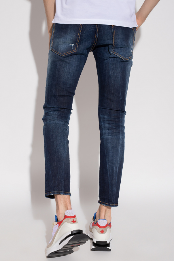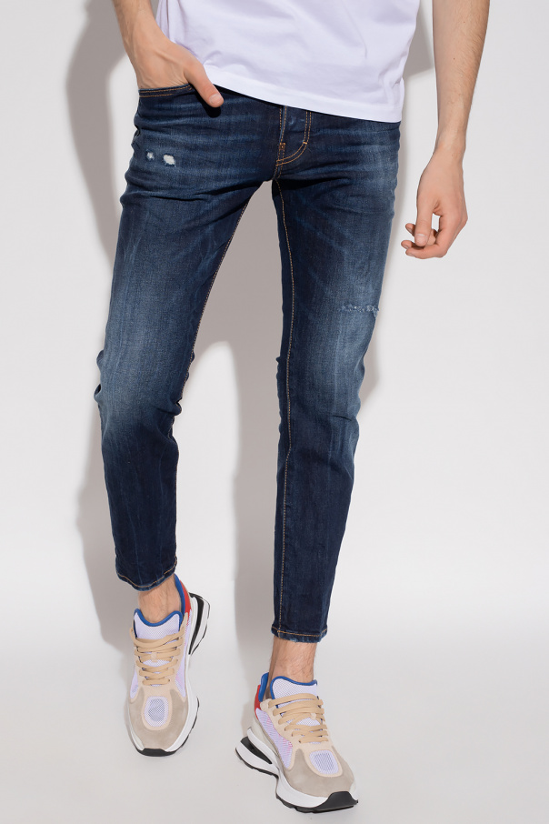 Navy ‘Skater’ distressed jeans with a drop crotch from Dsquared2, the ‘One Life One Planet’ capsule collection. Made of organic cotton with the GOTS certificate, this pair features button fastenings, red and white logo patch, stitching details, brown and blue logo patch at the back, five slip pockets and tapered legs.