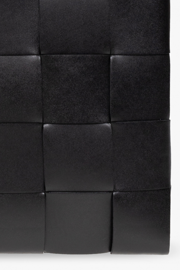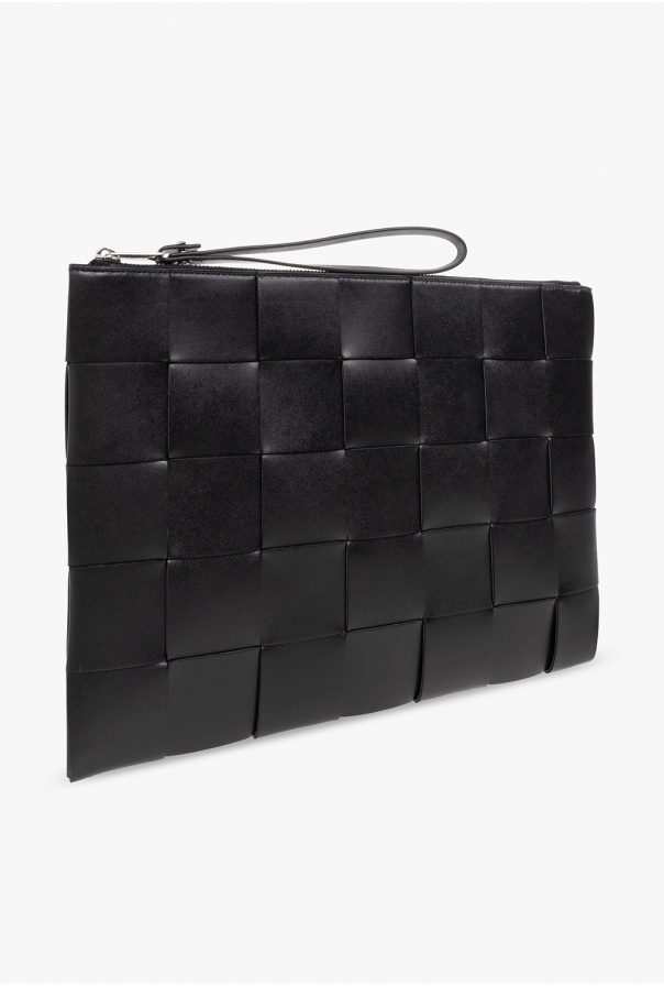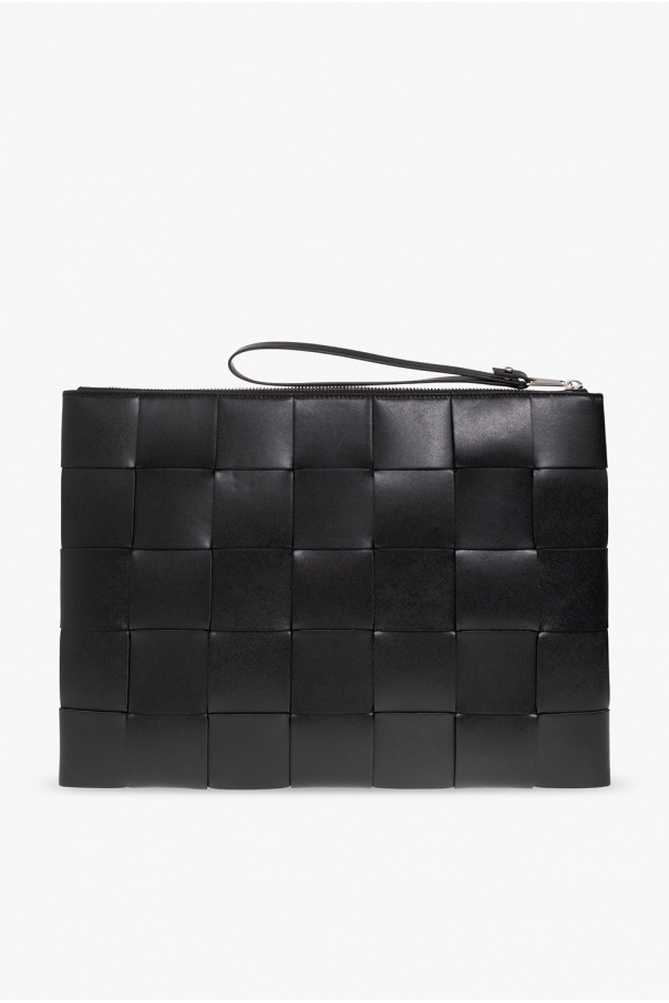 Black ‘Pouch Large’ handbag from Bottega Veneta. Crafted from calf leather, this model features a zip fastening with a wrist strap, the brand’s signature Intreccio weave, silver-tone metal hardware and one internal compartment with one slip pocket.