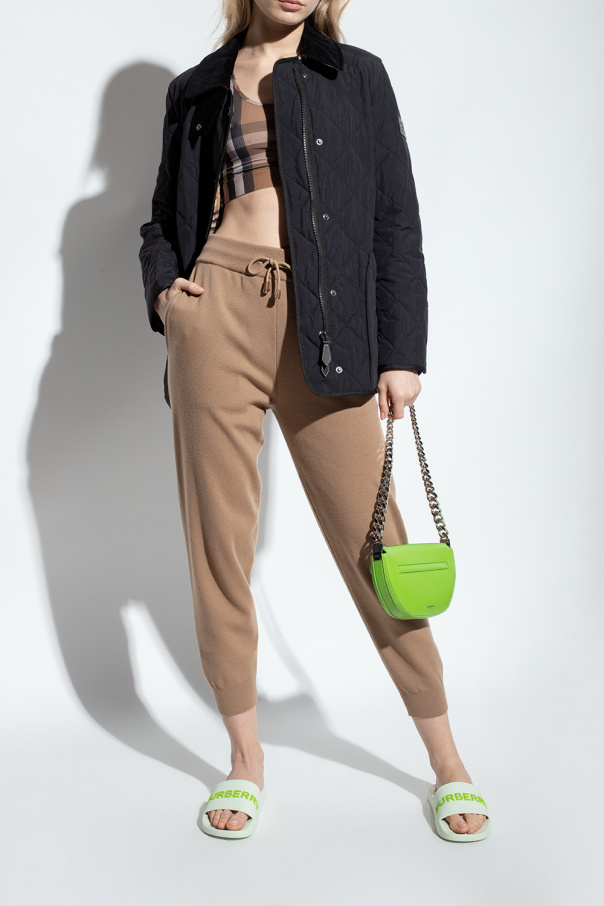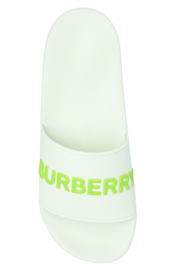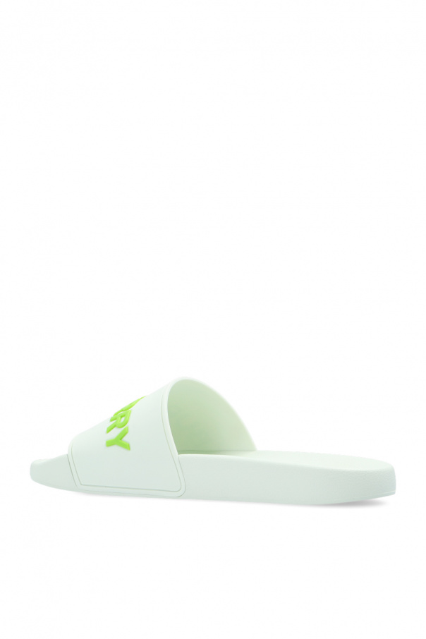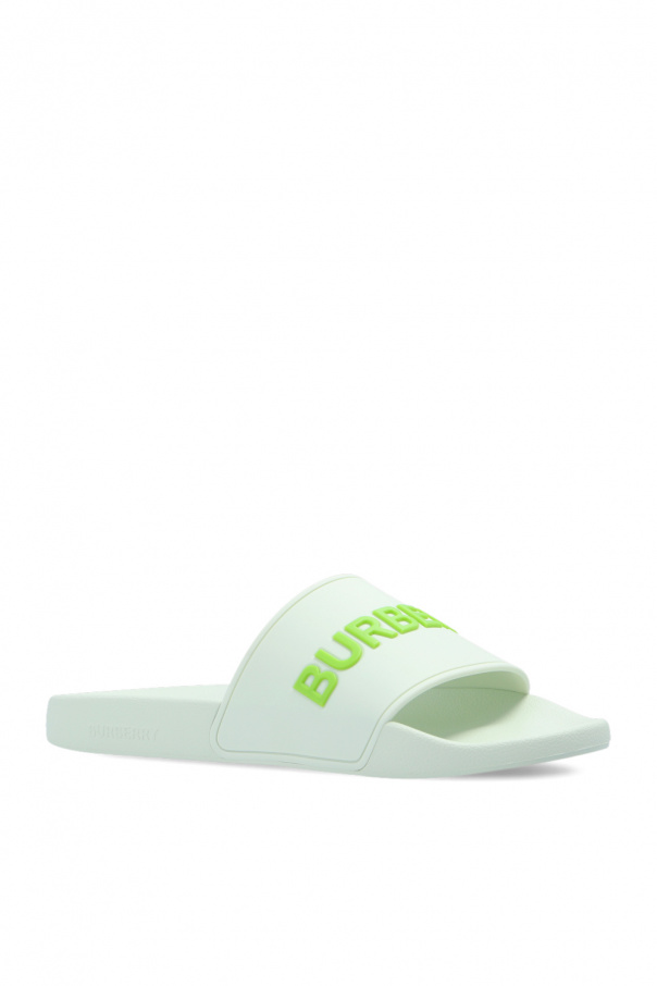 Light green ‘Furley’ slides from Burberry. Sitting on a light green rubber sole, this model showcases a raised logo detail on the front.