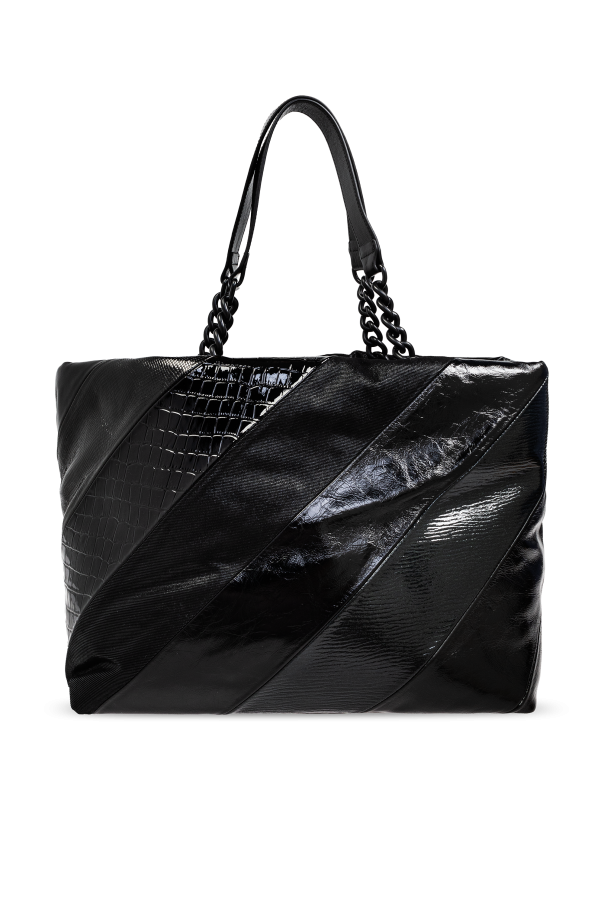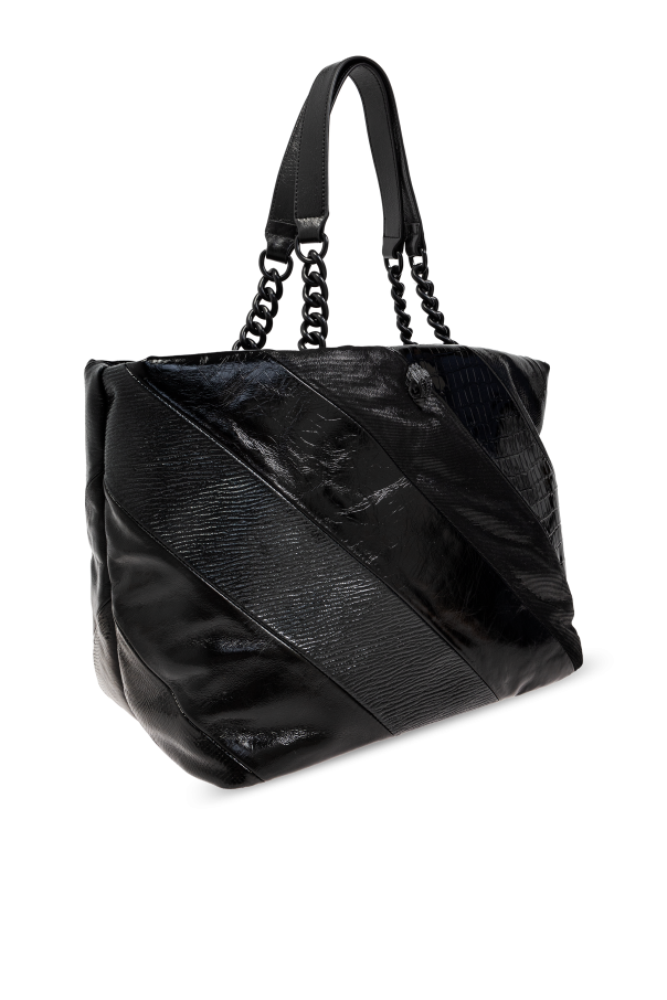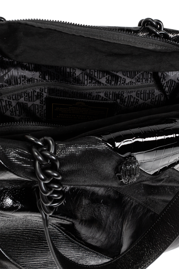 Introducing the exclusive Kensington Shoulder Shopper Bag from the esteemed house of Kurt Geiger. This rectangular masterpiece, adorned in sophisticated black, epitomizes the perfect blend of elegance and practicality for the modern woman. Meticulously crafted from high-quality leather, the exterior showcases a harmonious fusion of diagonal textures—ranging from crocodile-embossed to smooth, glossy finishes. The refined black stripes create a visually captivating and contemporary aesthetic. The bag's luxurious handles, an exquisite combination of black leather and chain, elevate its grandeur, while the interior, lined with designer-branded fabric, ensures authenticity and prestige. A robust and seamlessly integrated zipper adds to its functional elegance. Noteworthy is the decorative crown detail on the front, a hallmark of opulence. Inside, the bag features a spacious compartment, a zippered pocket, and two slip pockets, offering abundant storage for daily essentials. Why Choose This Product? Elegant Design: The diagonal patterns and crown detail exude luxury. High-Quality Materials: Crafted from premium leather with a designer-branded interior. Practicality: Ample space and multiple pockets for everyday use. Versatile Style: The black color makes it a versatile accessory for any outfit. Prestigious Brand: From the renowned Kurt Geiger, known for innovative and stylish designs.