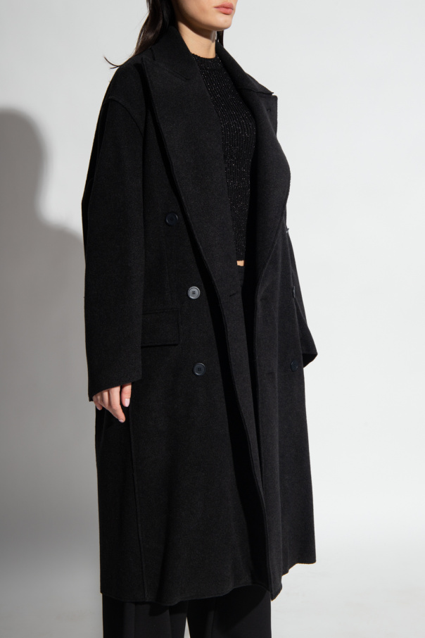 Black double-breasted coat from Balenciaga. Crafted from cashmere, this oversize design features buttons, peak lapels, two flap pockets, one slip pocket, long sleeves and single rear vent.