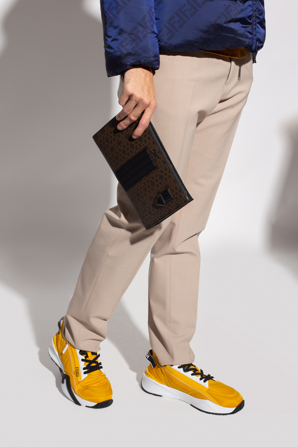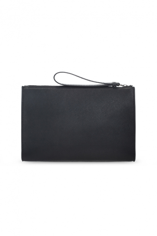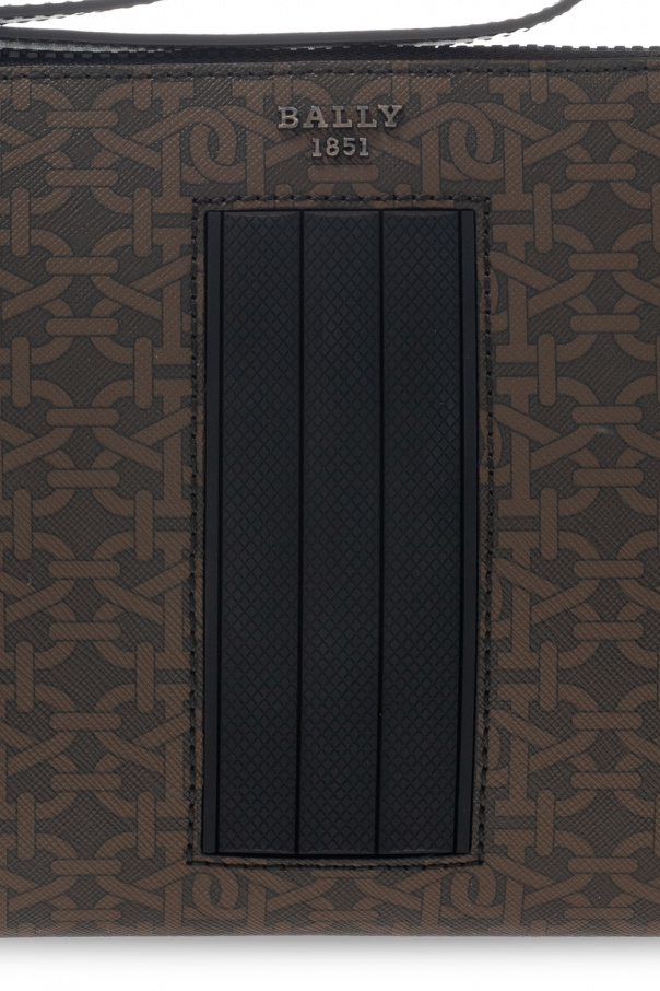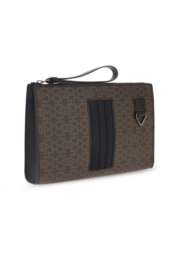 Black and brown hand bag from Bally. Fastened with a zip, this garment features a logo appliqué, decorative pattern, wrist strap, silver-tone metal hardware and one internal compartment with three slip pockets.