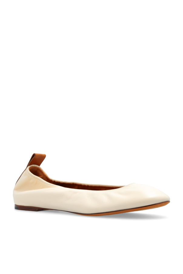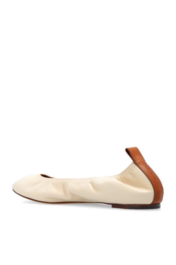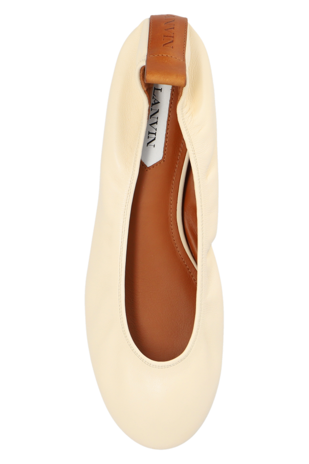 Cream ballet flats from Lanvin. Made of leather with a round toe, this model sits on a brown leather sole and features an elasticized trim and a brown patch with an embossed logo on the back.