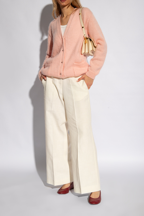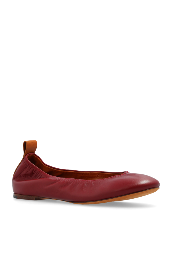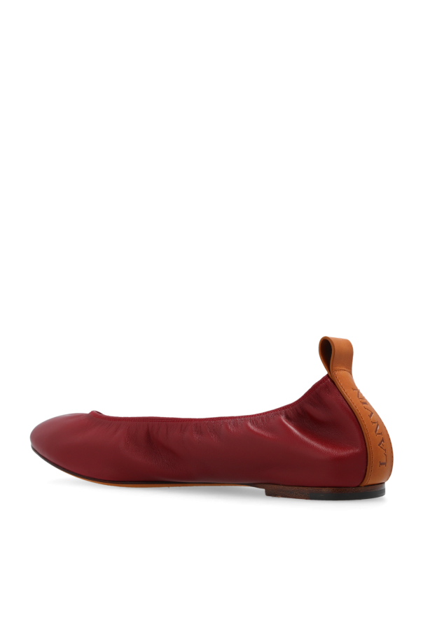 Red ballet flats from Lanvin. Made of leather with a round toe, this model sits on a brown leather sole and features an elasticized trim and a brown patch with an embossed logo on the back.