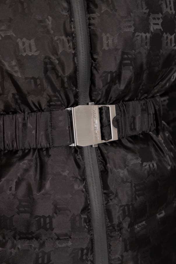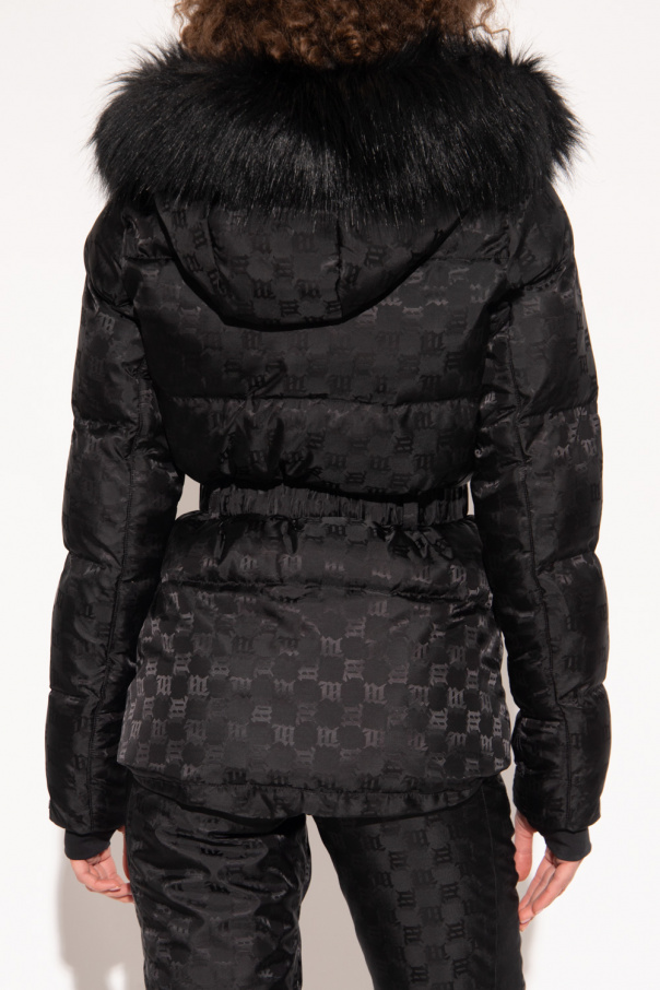 Black hooded ski jacket from MISBHV. Fastened with a zip, snap and belt with a clasp closure, this garment features a monogram pattern, silver-tone appliqué, two front zip pockets, including one on the sleeve, detachable hooded drawstring with faux fur and long sleeves with perforated insert, lining and cut-out details.
