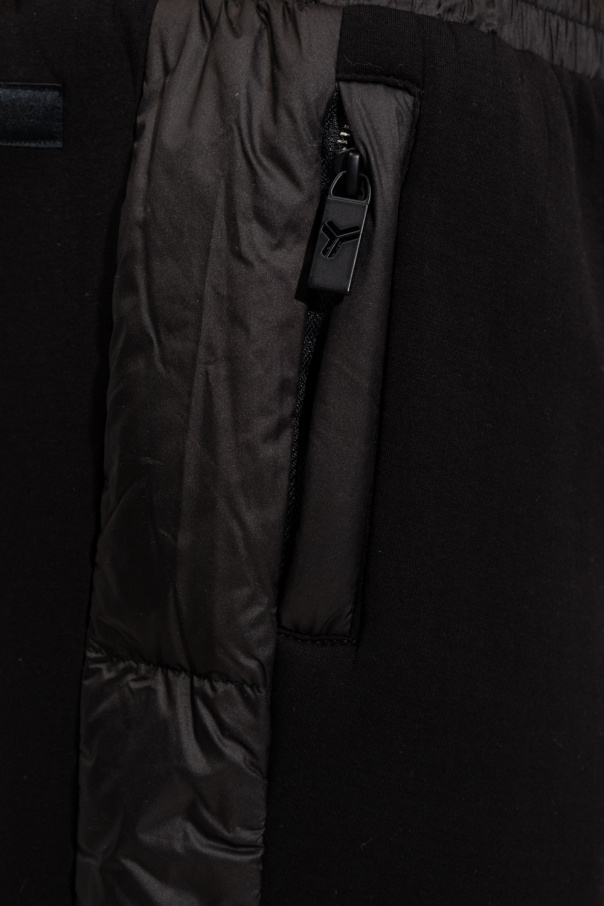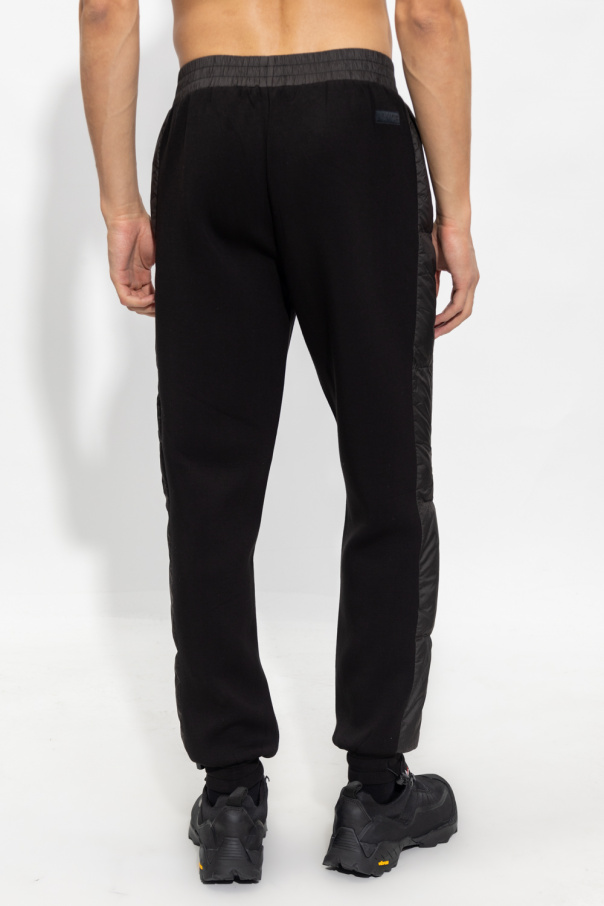 Black sweatpants from John Richmond, the ‘Sport’ line. Emblazoned with a logo patch at the back, this pair features an elasticated waistband, quilted side panels, two front zip pockets and elasticated cuffs with drawstrings.