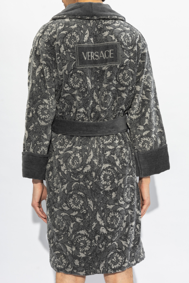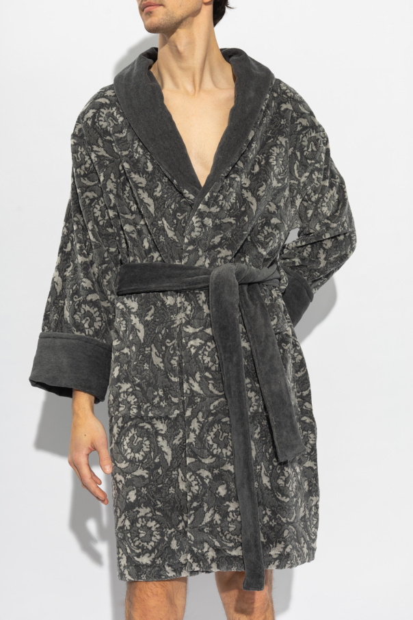 Grey bathrobe from Versace Home. Made of cotton with a touch of cashmere, this style is embellished with the brand's signature Barocco pattern and features a waist-cinching tie belt, long sleeves and two frontal pockets.