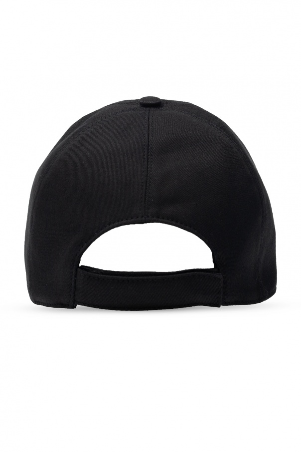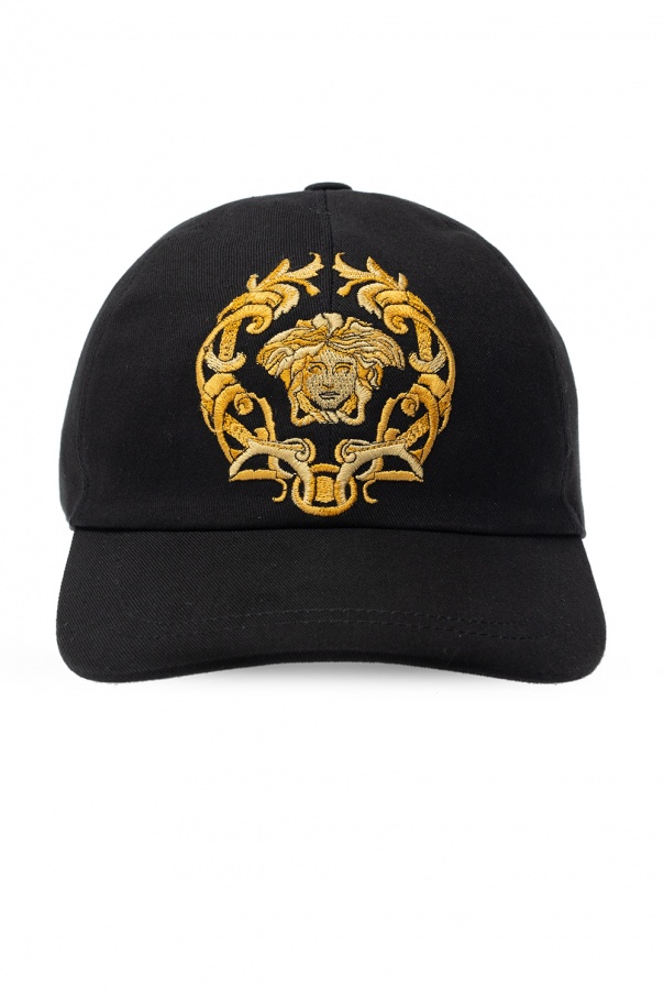 Black baseball cap from Versace. Cut from cotton, this piece of headwear secures via velcro strap on the back and showcases embroidered iconic Medusa head.