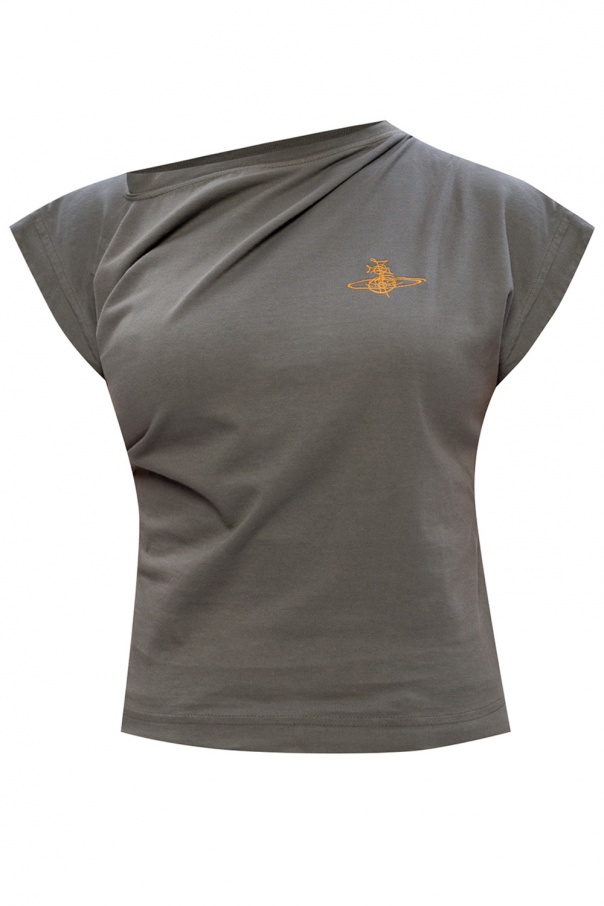 Grey crewneck tank top from Vivienne Westwood. Crafted from cotton with an asymmetric hem, this sleeveless style showcases the designer's signature beige logo embroidered on the front.