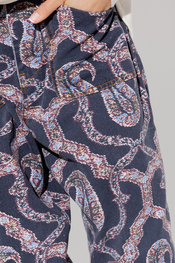 Navy jeans from Etro. Fastened with buttons with a decorative removable tie, this pair is complete with the brand’s signature paisley print, four slip pockets and slightly tapered, wide legs.