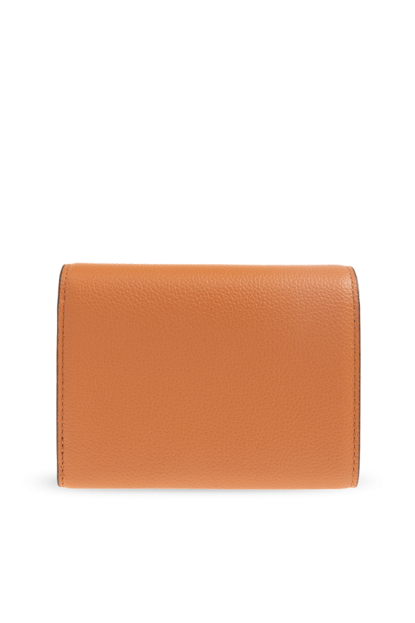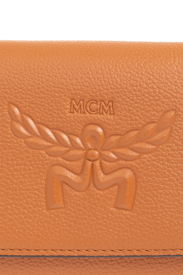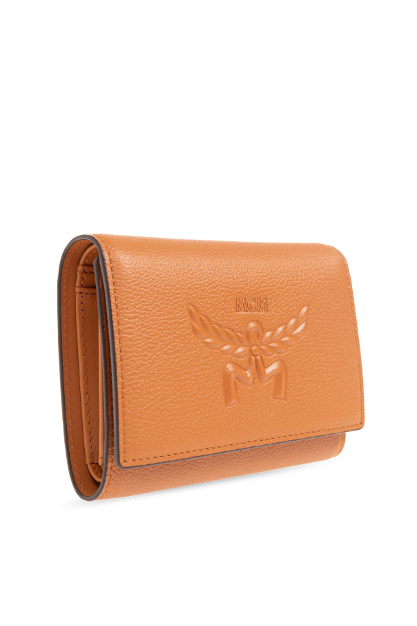 Brown ‘Himmel’ folding wallet from MCM. Made from leather, this item fastens via a snap and showcases a tactile logo on the front. It is complete with one bill compartment, one zip coin pocket and six card slots inside.