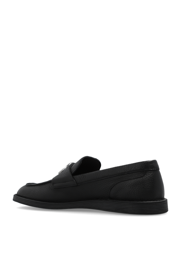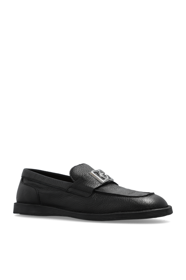 Black ‘New Florio’ loafers from Dolce & Gabbana. Made from grained leather, this model sits on a black rubber sole and features a frontal strap accentuated with silver-tone logo hardware.