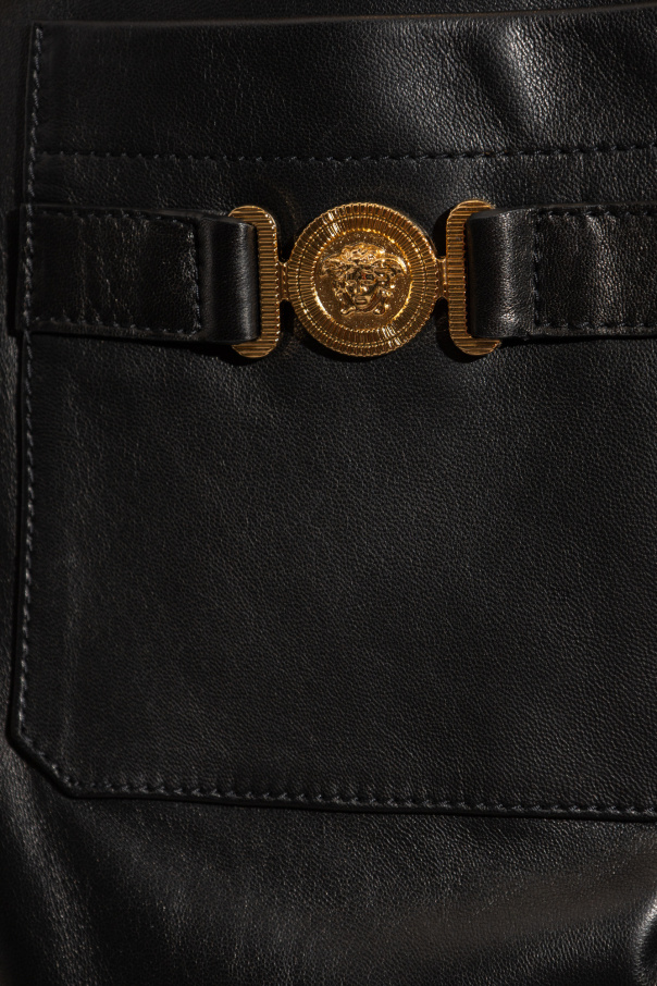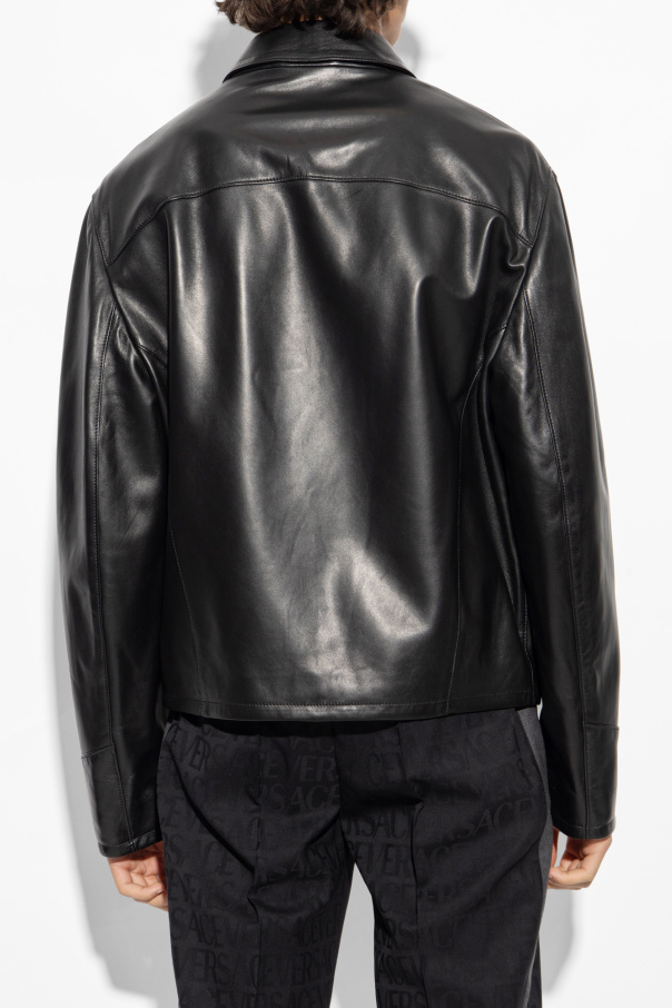 Black jacket from Versace. Made of lamb leather, this garment features a zip, signature gold-tone Medusa Biggie appliqué, three slip pockets on the front, a collar and long sleeves.
