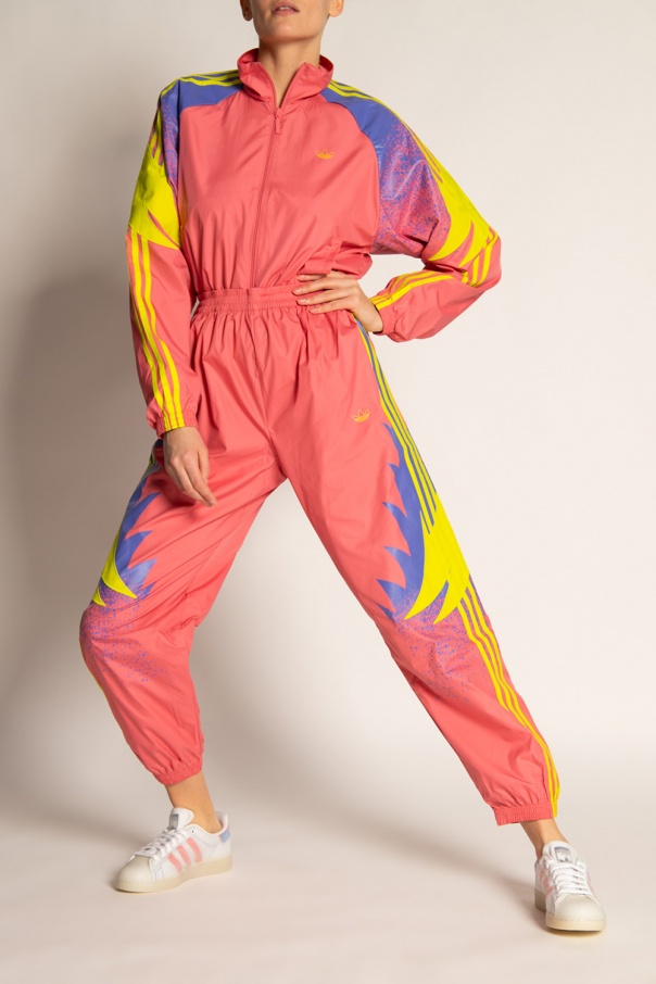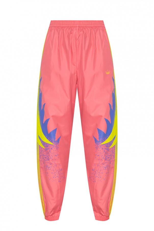Pink, purple and yellow sweatpants from ADIDAS Originals. Fastened with drawstrings, this garment features a neon yellow logo print, the signature three side stripes and ribbed cuffs.