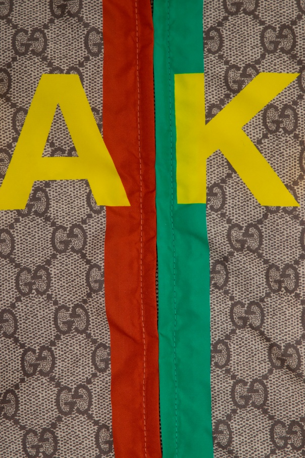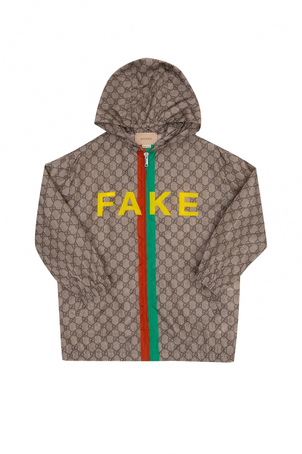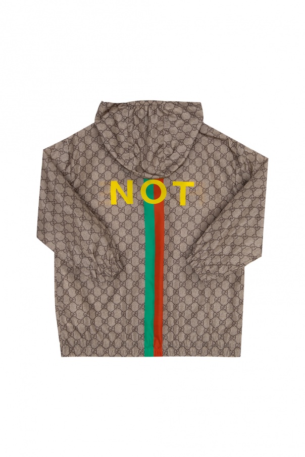 Beige and brown hooded jacket from Gucci Kids. Illustrated with the brand's iconic GG pattern and a yellow, green and red graphic print, this item features a zip fastening, two welt pockets and an elasticated bottom hem and cuffs.