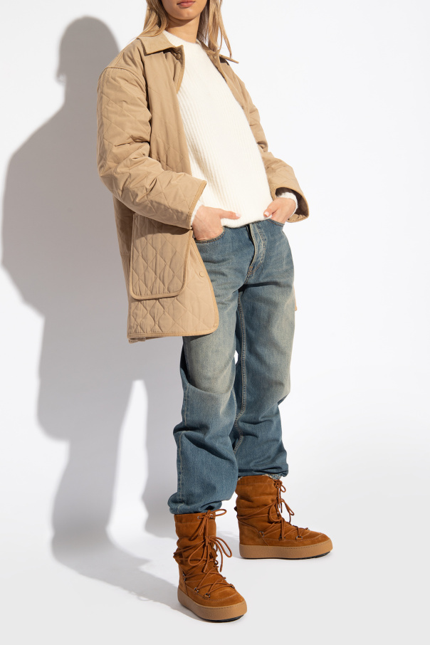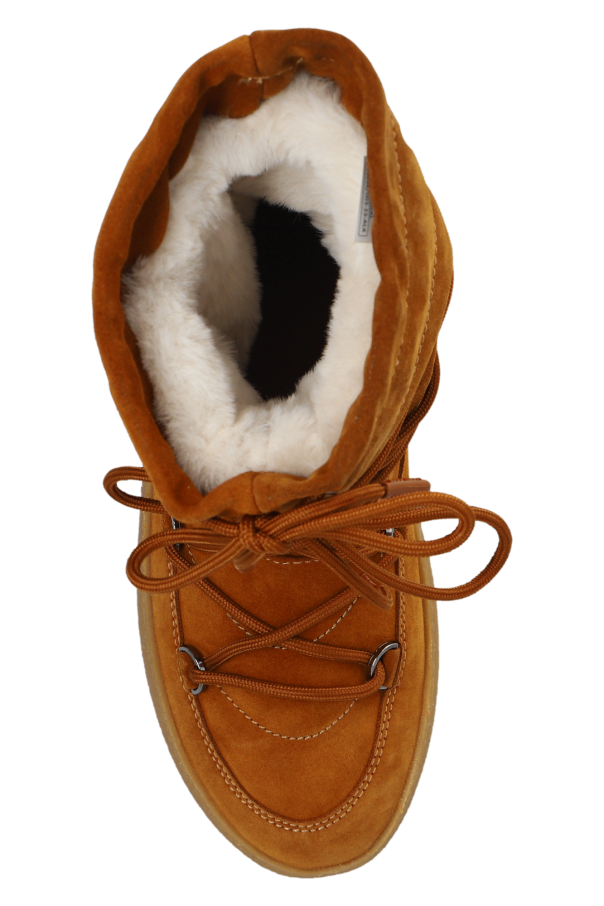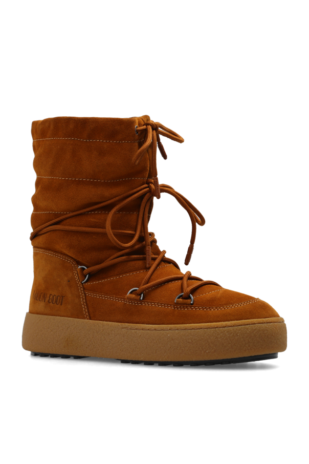 Brown ‘Ltrack’ snow boots from Moon Boot. Made of waterproof suede, this lace-up model showcases an embossed logo on the side and a light midsole with suction cups on a brown and black tread rubber sole to ensure good surface control.